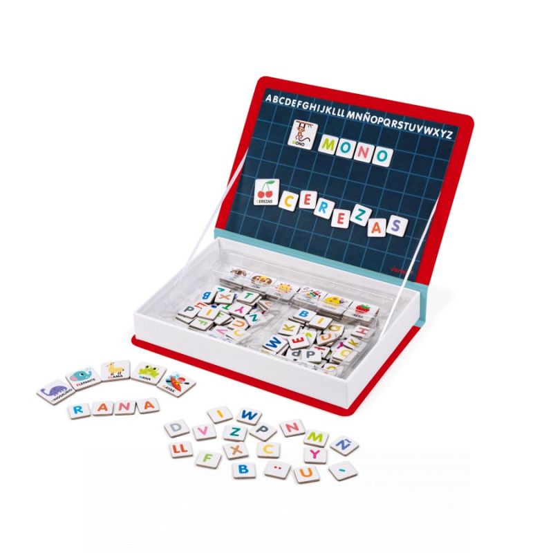 Магнитна книжка на френската фирма Janod, която съдържа 26 магнита с илюстрации на хора, животни или предмети и 116 магнитни букви. Всяка от 26те магнитни плочки е с картинка, чиято първа буква съответства на буква от азбуката, а детето трябва да напише цялата дума с помощта на магнитните букви.Предната корица на книжката е магнитна и детето може да подрежда магнитите върху нея. В останалата част, която е като кутия, магнитите заедно с картите - могат да бъдат съхранени прилежно. Картонената кутия във формата на книга е удобна носене или съхранение в домашната библиотека.