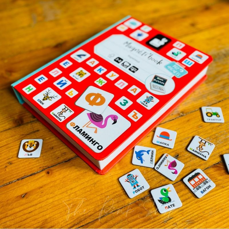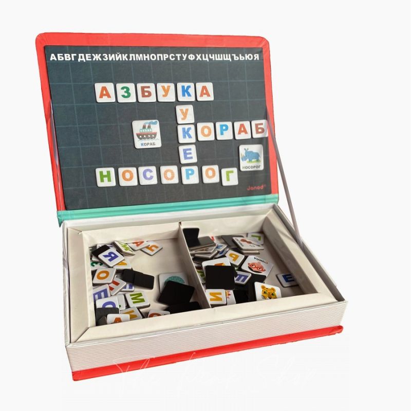 Магнитна книжка на френската фирма Janod, която съдържа 30 магнита със страхотни илюстрации и 116 магнитни буквички! Всяка от 30те магнитни плочки е с картинка, чиято първа буква съответства на буква от азбуката, а детето трябва да напише цялата дума с помощта на магнитните букви.Предната корица на книжката е магнитна и детето може да подрежда магнитите върху нея. В останалата част, която е като кутия, магнитите заедно с картите - могат да бъдат съхранени прилежно. Картонената кутия във формата на книга е удобна носене или съхранение в домашната библиотека.
