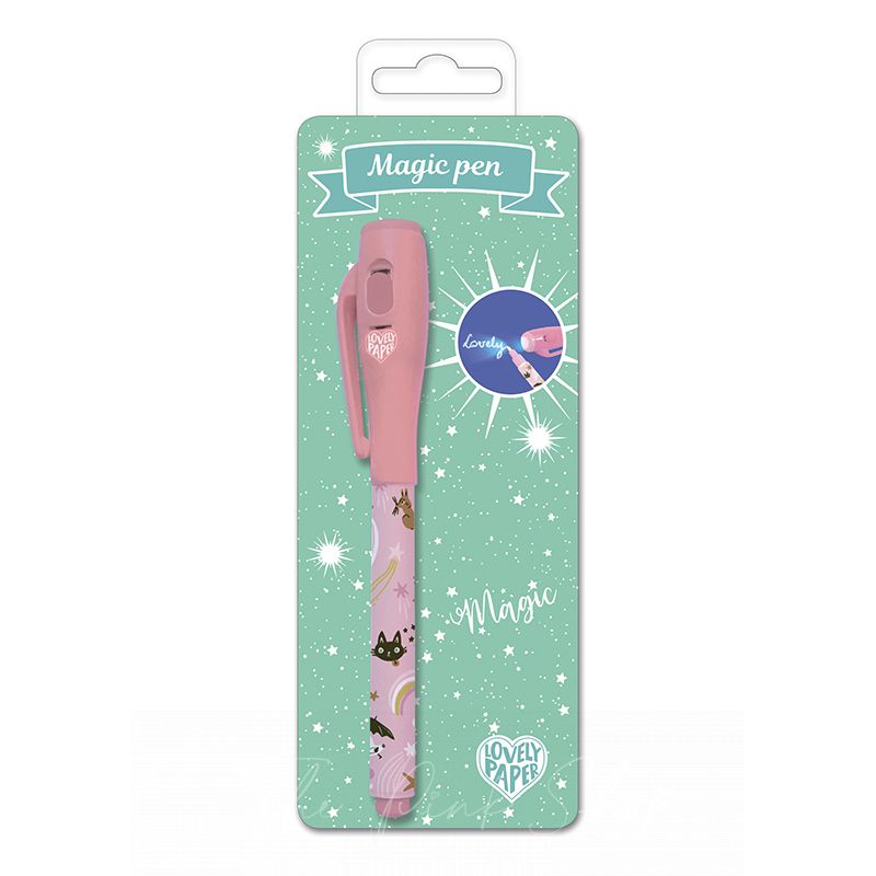 Елегантена магическа химикалка на френската фирма Djeco. Работи с невидимо мастило, което се появява само под лъчите на UV светлина, скрита в капачката на химикалката. Химикалката е с бутон за включване и изключване и работи с 3 батерии LR44 HD, които са включени в комплекта.