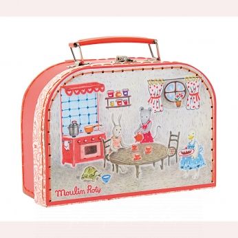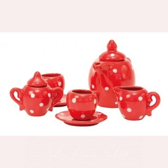 Детски комплект за чай направен от керамика от френската фирма Moulin Roty. Комплекта съдържа две чашки за чай, чайник, захарничка и каничка за мляко. Десена е червен на бели точки и е много шик. Елегантно опакован в куфарче, за да бъде готов за употреба навсякъде.