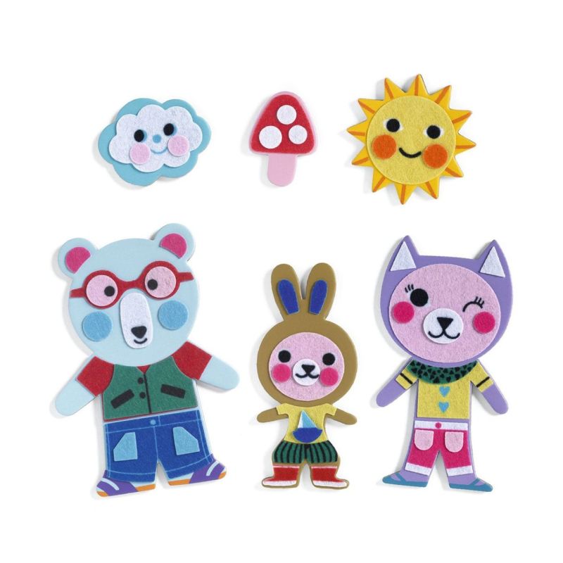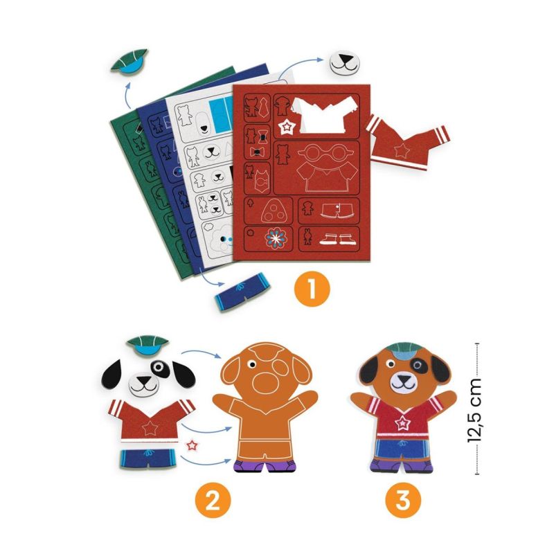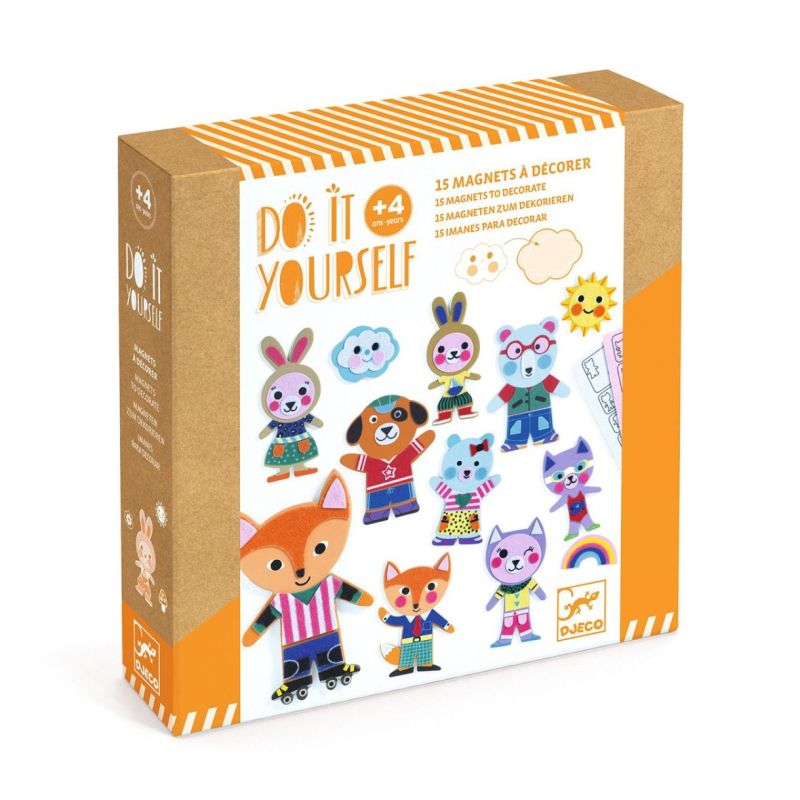 Творчески комплект за декориране на 15 магнитчета с животни. Включва 15 магнита (5 големи и 10 малки), 8 комплекта филцови стикери и инструкции.