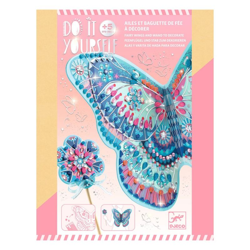 Комплект с картонени крила и магическа пръчка за украса със стикери и камъни. Включва крила, пръчка, ластици, стикери и инструкции.
