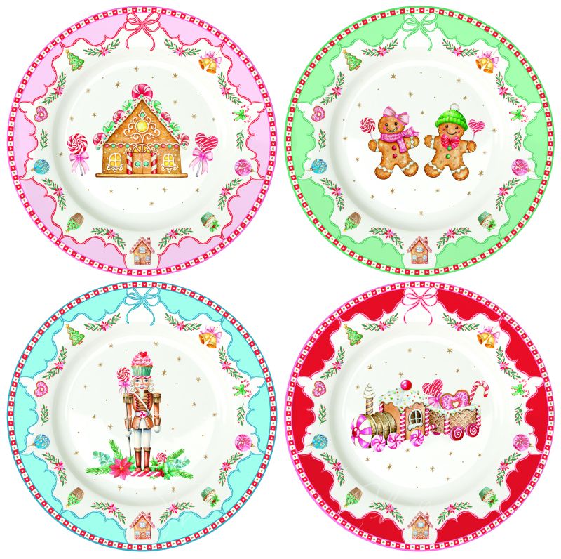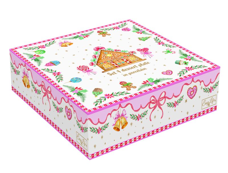 Комплект от 4 порцеланови десертни чинии Ø 19,5 см в цветна кутия от серията SWEET CHRISTMAS на EasyLife.