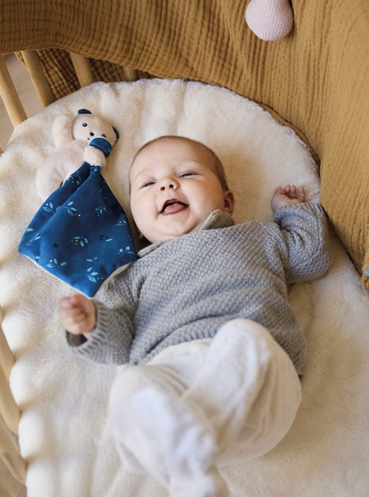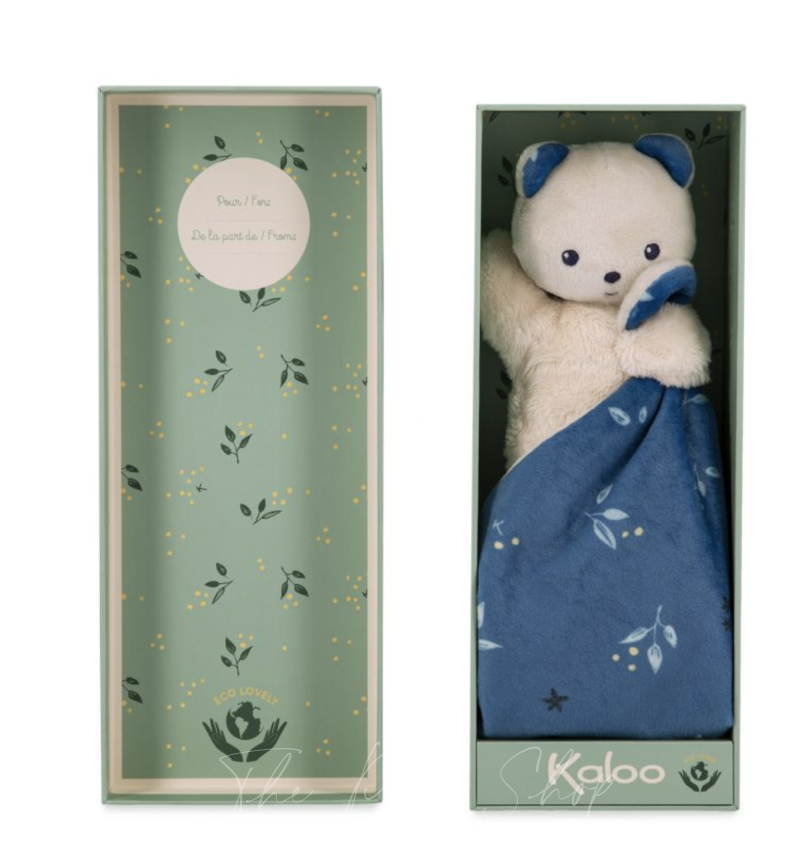 Мече, завито в меко одеялце – нежен спътник за бебето. Изработено от рециклирани материали и пълнеж от пластмасови бутилки. Мекото тяло от микрокадифе е лесно за хващане, а одеялцето е украсено с листенца. Представено в красива подаръчна кутия.