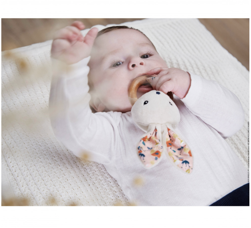 Мека дрънкалка със заешка глава и дървена халка за лесно хващане. Вградено звънче стимулира слуха, а декоративната панделка придава деликатен акцент.