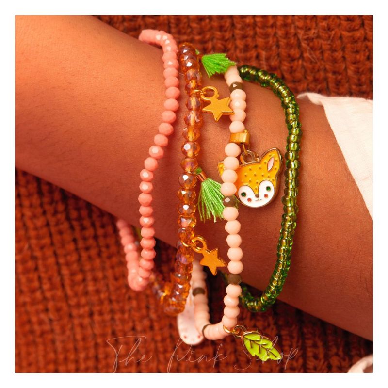 Вдъхновена от гората, гривната Automne е ода на природата. Тя се състои от две малки гривни, украсени с висококачествени акрилни мъниста и два емайлирани медальона от неръждаема стомана с лисица и листо. Нежните зелени и златисти детайли ще придадат топлота и стил на китката ви. Усилената двойна еластична нишка я прави изключително издръжлива и лесна за поставяне, без да е необходима закопчалка. Съдържание: 1 гривна с акрилни мъниста, 1 талисман лисица и 1 талисман листо (от емайлиран метал). Предимства: Висококачествени материали: емайлирани неръждаеми стоманени висулки и леки, устойчиви акрилни мъниста. Двойна еластична нишка за допълнителна устойчивост, лесна за поставяне без закопчалка.------------