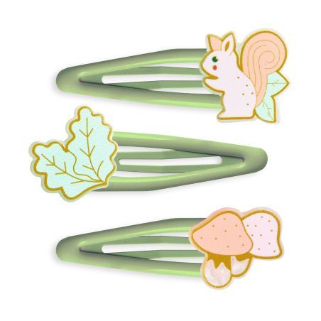 Комплектът включва три метални фиби с бродерия от плат с изображения на елен, заек и лисица.