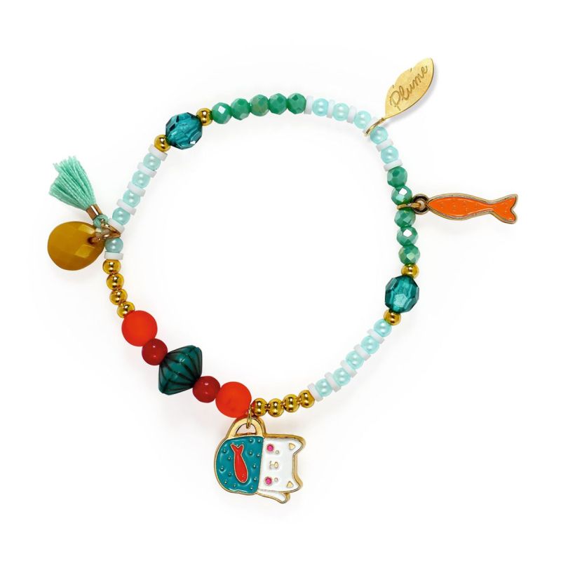 Ще изглеждате изключително сладко с гривната Amay, вдъхновена от котките. С акрилни мъниста и две емайлирани метални висулки с котка и риба, както и памучна помпончеста пискюл, тя ще добави нотка забавност и елегантност към китката ви. Двойната еластична нишка я прави изключително устойчива и лесна за поставяне, без да е необходима закопчалка. Съдържание: 1 гривна с акрилни мъниста и 2 различни висулки – емайлирана метална котка и риба – и 1 памучen пискюл. Предимства: Висококачествени материали: емайлирани неръждаеми стоманени висулки и леки, устойчиви акрилни мъниста. Двойна еластична нишка за допълнителна устойчивост, лесна за поставяне без закопчалка.