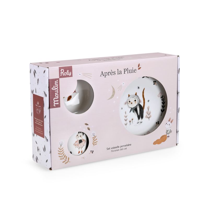Открийте порцелановия комплект съдове от колекцията "След дъжда" на Moulin Roty - порцеланов комплект съдове, нежно илюстриран, за да се храни вашето мъниче като възрастен. Подходящи са за миене в миялна машина, както и за микровълнова. Съдовете са защитени отдолу с противоплъзгащ се и свалящ се силикон, за да се предотврати падане.