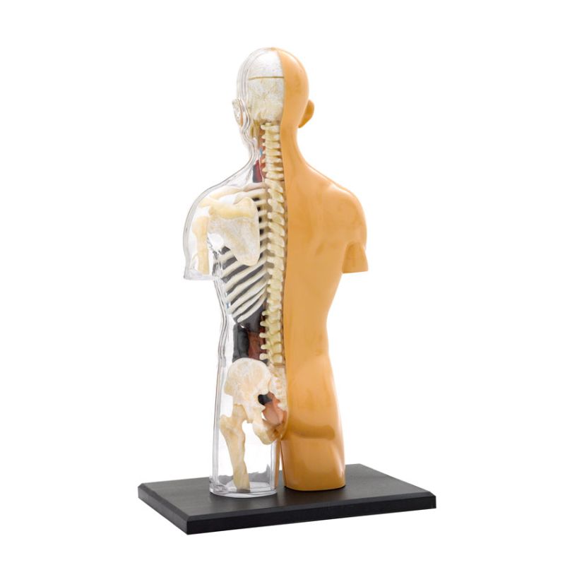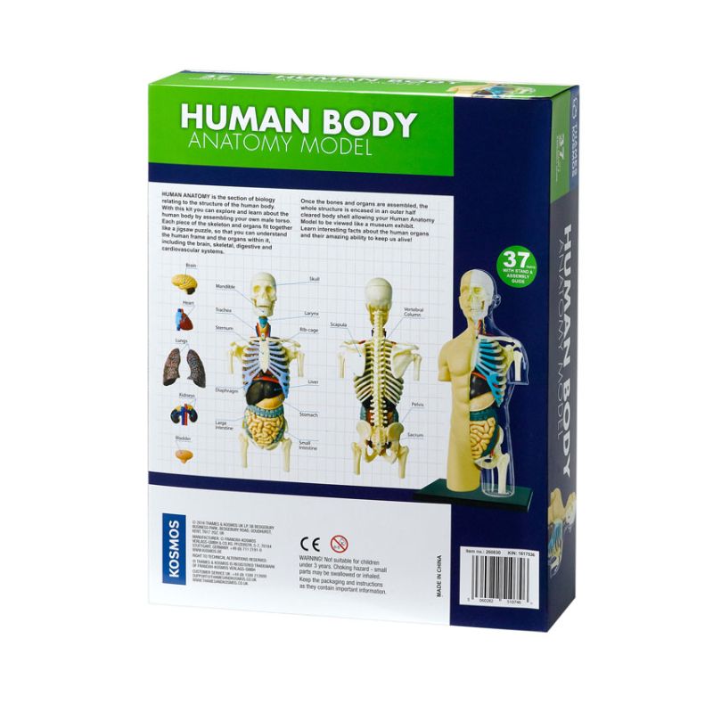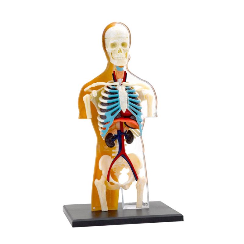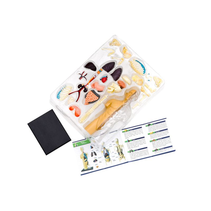 Образователен анатомичен модел на човешки торс за сглобяване. Частите на скелета и органите се подреждат като пъзел и се поставят в полупрозрачен корпус. Мащаб 1:6, общо 37 части. Включва упътване на български език.