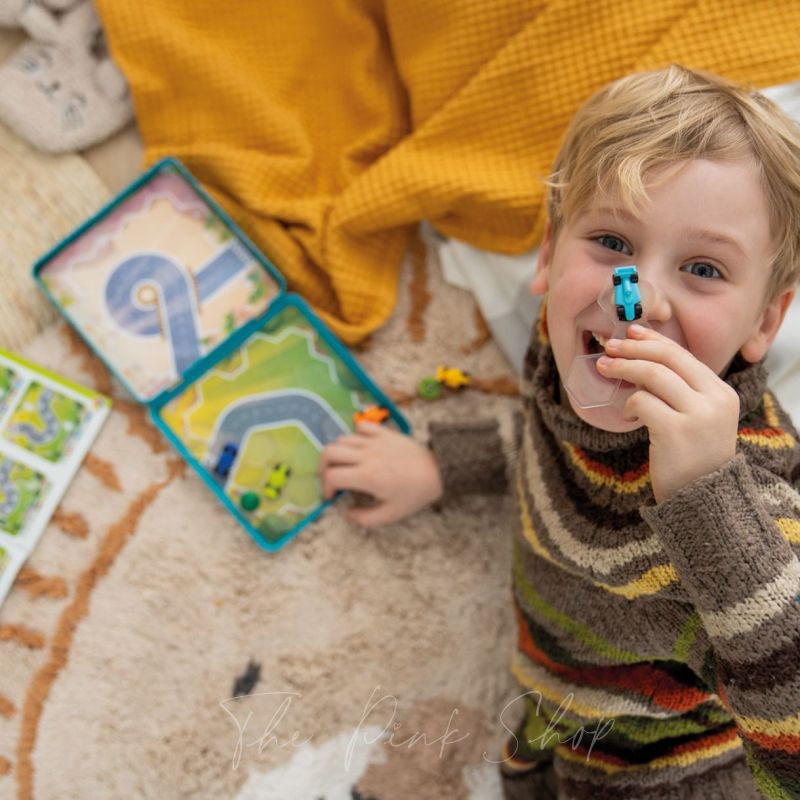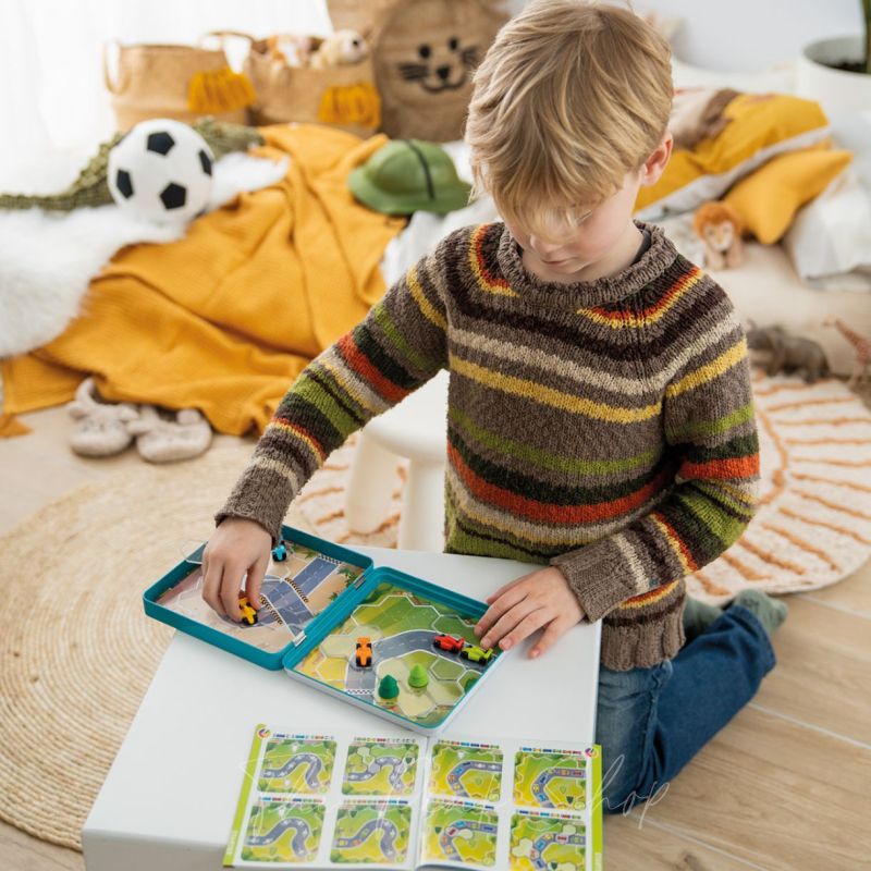 Готови ли сте да завъртите тази 3D игра за пътуване? Намерете правилната позиция на тези магнитни състезателни коли и вижте кой наистина удря върха! Уникална игра в удобна кутия за пътуване. Станете шампион на 48-те предизвикателства. Дами и господа... стартирайте вашите (мозъчни) двигатели! Съдържание: 1 метална кутия за пътуване, която функционира като дъска за игра 2 двустранни карти с писти 8 магнитни части (6 със състезателни коли, 2 с дървета) книжка с 48 предизвикателства и решения Умения: Решаване на проблеми Планиране Пространствено мислене