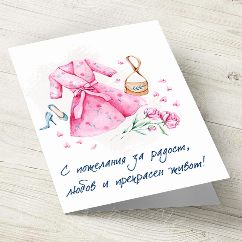 Картичка с авторска илюстрация върху акварелен картон. С надпис отпред "С пожелания за радост, любов и прекрасен живот!"