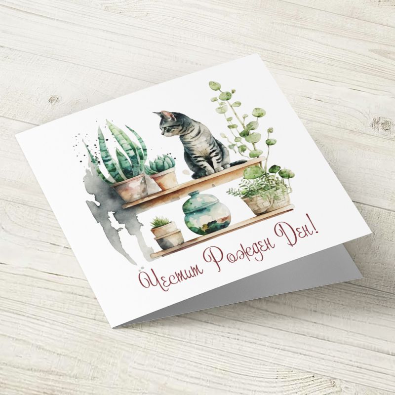 Картичка с авторска илюстрация върху акварелен картон. С надпис отпред "Честит Рожден Ден"