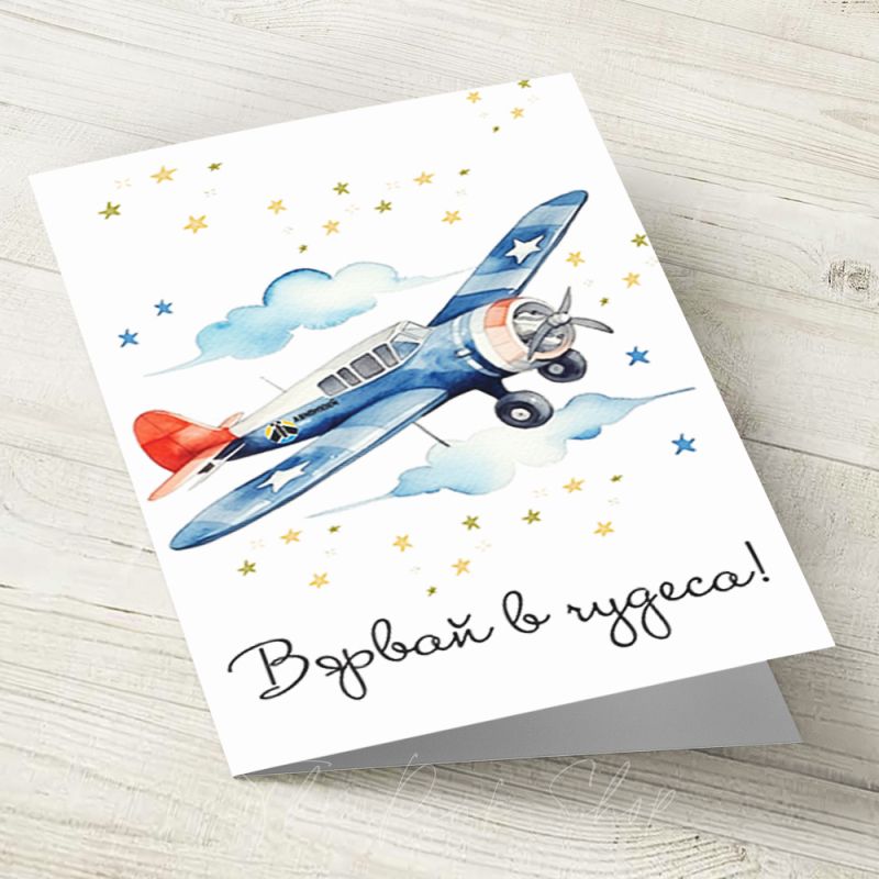 Картичка с авторска илюстрация върху акварелен картон. Със самолет надпис отпред "Вярвай в чудеса"