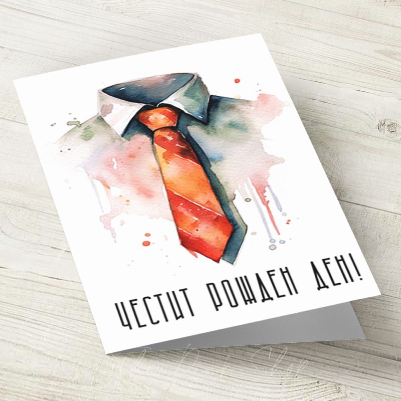 Картичка с авторска илюстрация върху акварелен картон. С надпис отпред "Честит Рожден Ден"