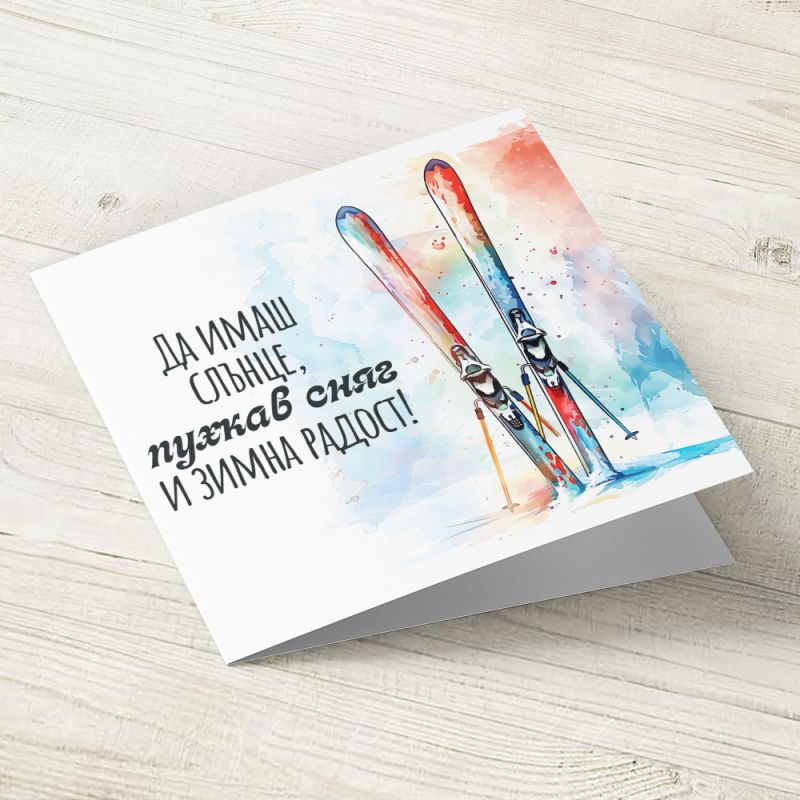 Картичка с авторска илюстрация върху акварелен картон. С надпис отпред: Да имаш слънце, пухкав сняг и зимна радост!