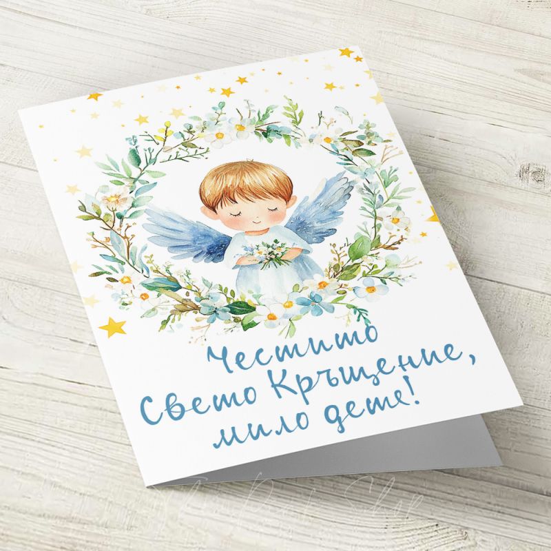 Комплект плик за писмо и картичка с авторска илюстрация върху акварелен картон. Надписът отпред е:Честит Свето Кръщение, мило дете!