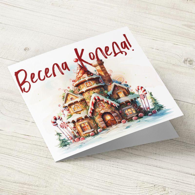 Картичка с авторска илюстрация върху акварелен картон. С надпис отпред: Весела Коледа!