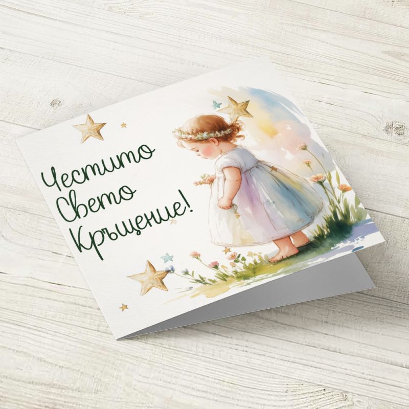 Картичка с авторска илюстрация върху акварелен картон. С надпис отпред: Честито Свето Кръщение!