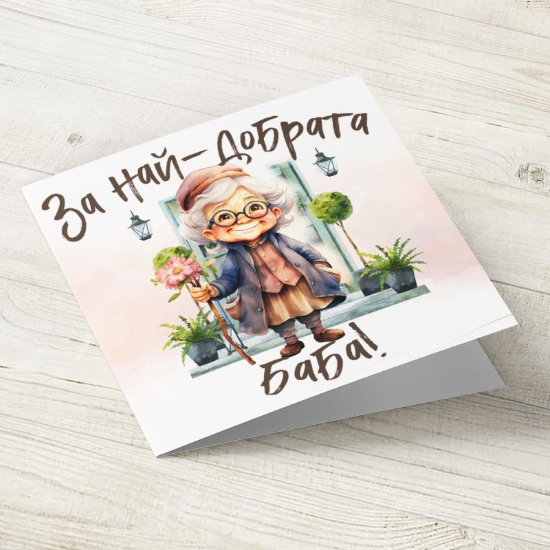 Картичка с авторска илюстрация върху акварелен картон. С надпис отпред: За най-дбрата баба!