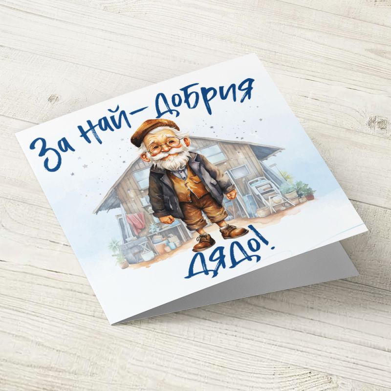 Картичка с авторска илюстрация върху акварелен картон. С надпис отпред: За най-дорбия дядо!