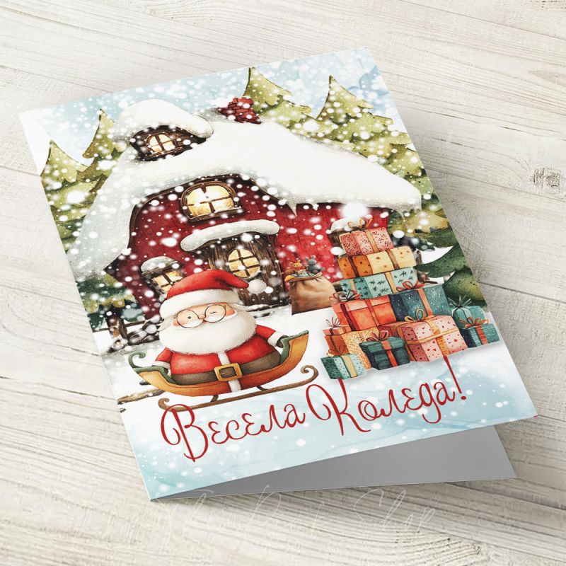 Комплект плик за писмо и картичка с авторска илюстрация върху акварелен картон. Надписът отпред е:Весела Коледа!