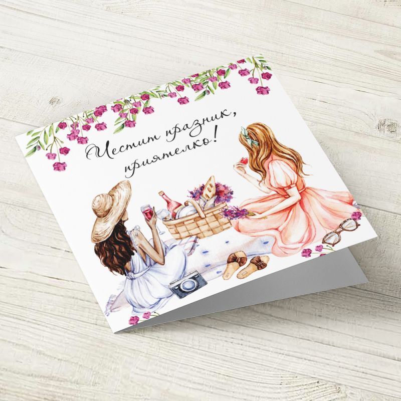 Картичка с авторска илюстрация върху акварелен картон. С надпис отпред: Честит празник, приятелко!