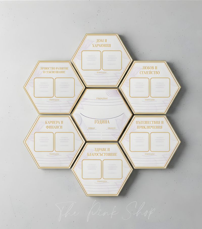 - 7 шестоъгълни елемента - визуални модули за фокус, лесни за пренареждане, изработени от здрав и стабилен картон.