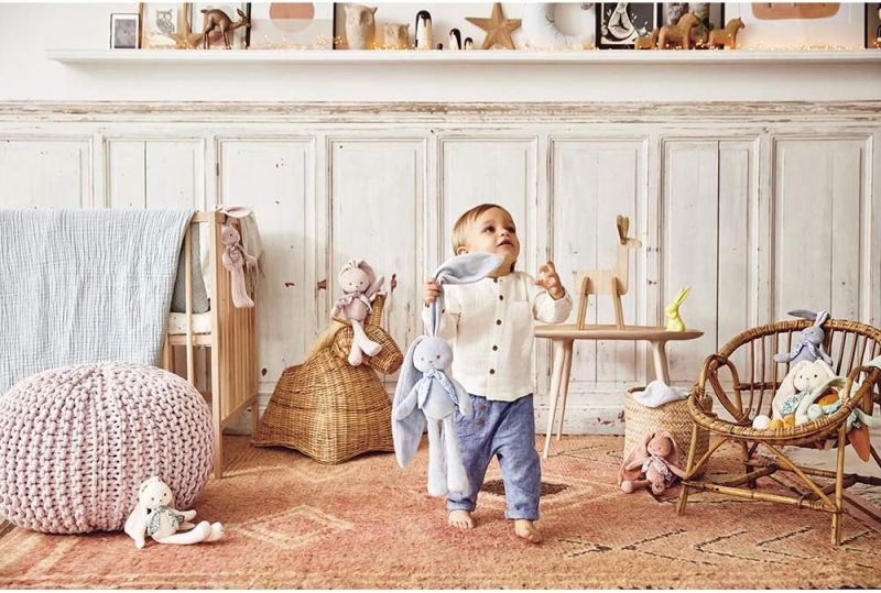 Плюшеното зайче е създадено с внимание към мекотата, функционалността и радостта от играта. В топъл кремав цвят и с изразително лице, то се превръща в естествена част от ежедневието на детето още от първите дни. Подходящо за бебета от раждането нататък, зайчето предлага не само комфорт при гушкане, но и възможност за активна, сензорна игра. Най-характерната черта на тази текстилна играчка са дългите му уши. Те не само придават отличителна визия, но и изпълняват практическа функция – позволяват лесно закачане на играчката върху количка, легло, дръжка на чанта или други повърхности. Благодарение на тях, играчката остава винаги наблизо и се превръща в удобен спътник по време на пътуване или разходка. Тялото е изработено от изключително мек полиестер, което гарантира приятен допир и безопасност за нежната бебешка кожа. Пълнежът също е мек и лек, което прави зайчето лесно за хващане и пренасяне. Играчката се пере машинно при 30°C, което улеснява поддържането ѝ в чист и хигиеничен вид. Тя се предлага в стилна подаръчна кутия, която включва специално място под капака за персонално послание. Това прави зайчето отличен избор за подарък при раждане, кръщене или друг семеен повод. Зайчето съчетава практичност, изчистен дизайн и текстилна мекота в един универсален продукт. С дългите си уши, приятен външен вид и възможност за персонализация, това зайче бързо ще се превърне в една от любимите играчки у дома – винаги под ръка, винаги готово за прегръдка.