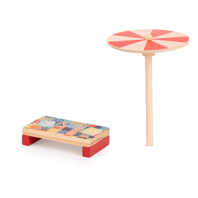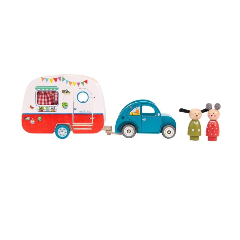 Ремаркето е изработено от дърво, включва комплект мебели, карирани платнени завеси и подвижен покрив, за да се възхищавате на звездното небе през нощта.