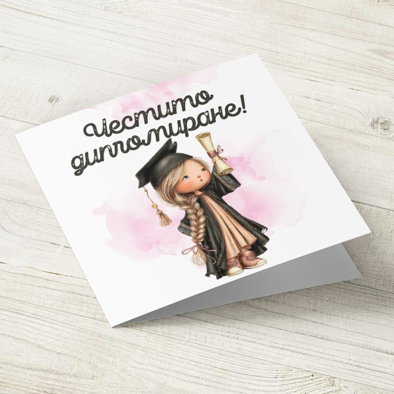 Картичка с авторска илюстрация върху акварелен картон. С текст "Честито дипломиране!"